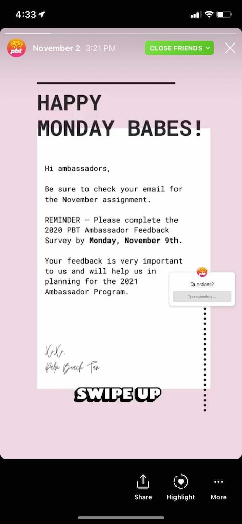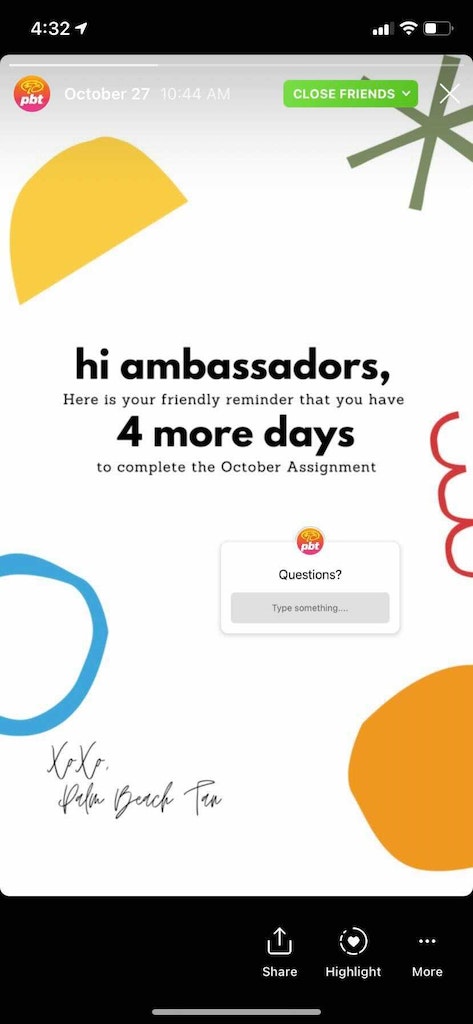 Give your ambassadors content to work with, along with creative freedom. We send our PBT ambassadors a monthly social media “assignment.” These assignments include a prompt that ties back to a business goal (e.g., promoting a new product line or in-store offer) or follows seasonal trends (e.g., tips for maintaining a subtle glow in winter).